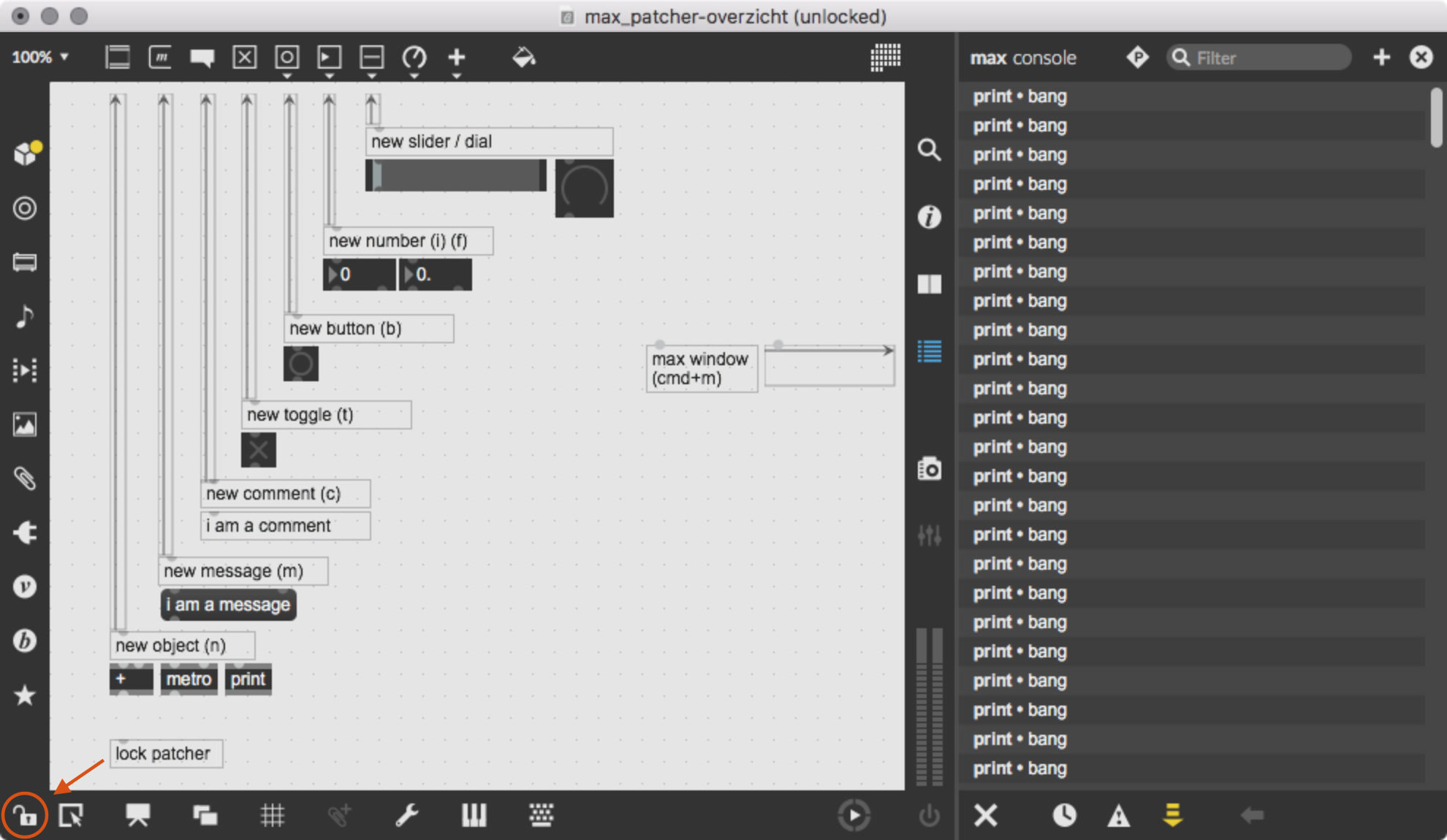 cmd/ctrl + m). In de Max Console kan je foutmeldingen en andere zaken zien zoals dingen die je print. Lockde patch (slotje links onderin) en druk op detoggleom de metro te starten.
