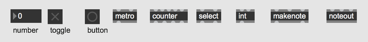 [select]object aan de messages, en zorg ervoor dat de messages hun getal doorsturen naar de[makenote]en[noteout]combinatie (uit de vorige opdracht) zodat je de MIDI-noot kunt horen.