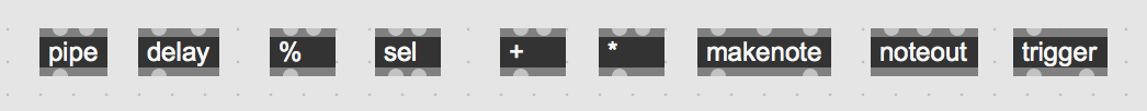 [kslider]-object en zorg dat het klikken op de kslider een MIDI-noot afspeelt via[makenote]en[noteout]. - Maak de noot "los" van het octaaf (zodat alleen de relatieve semitoon overblijft) en gebruik een